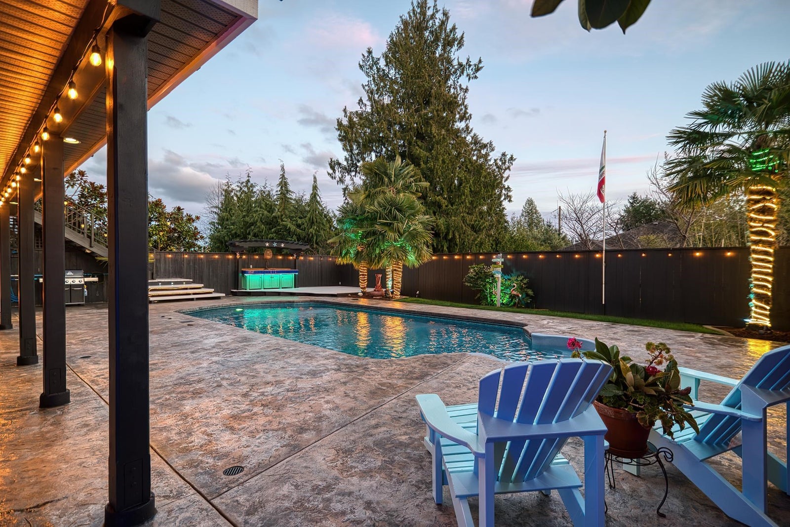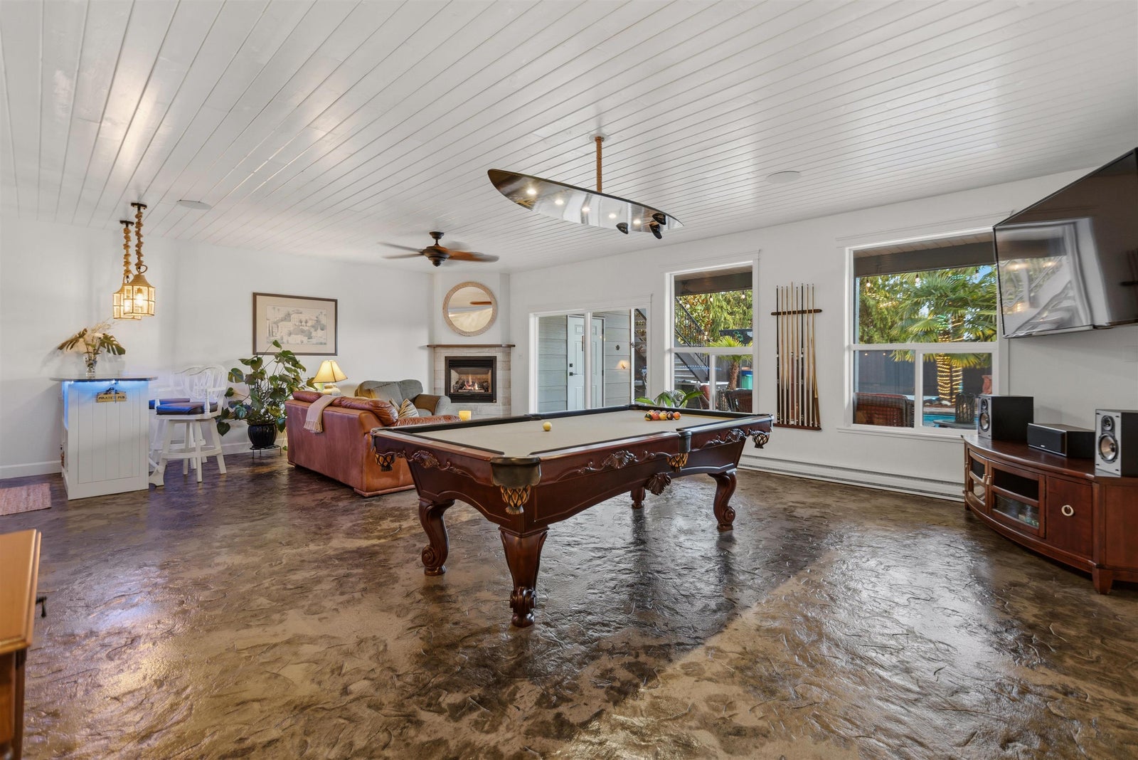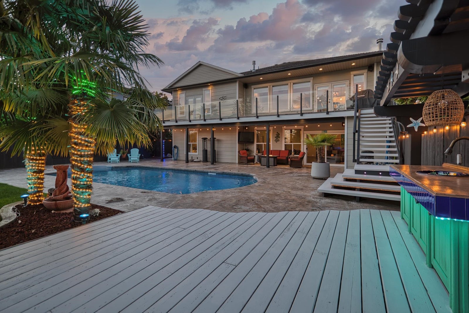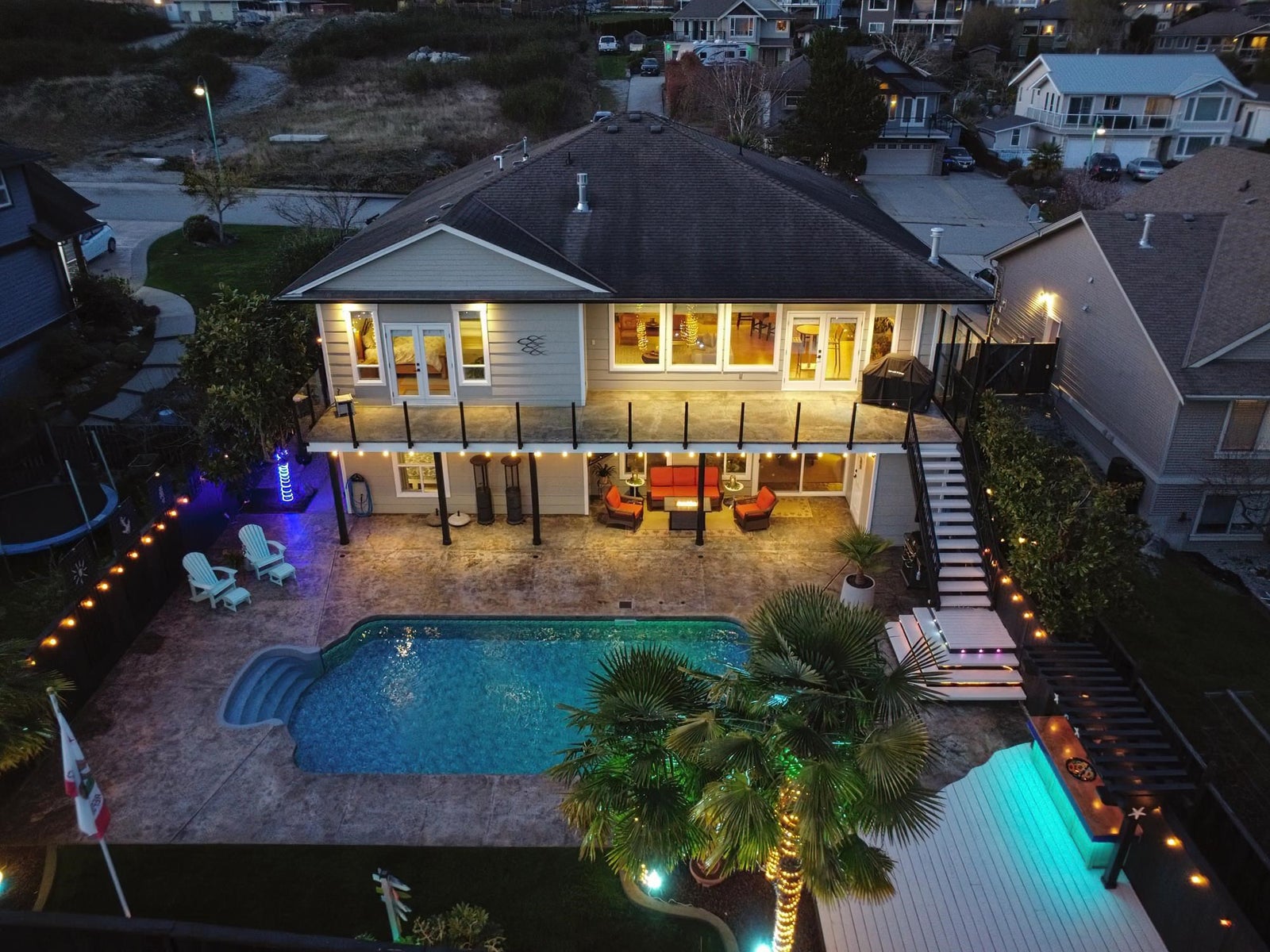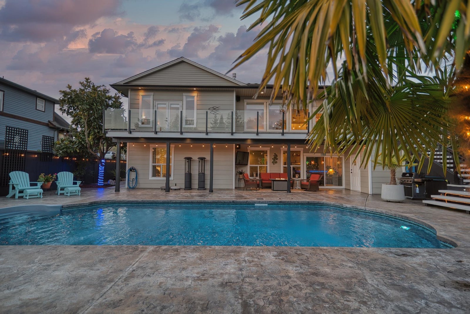 This exceptional ICF-built executive home offers the ultimate in resort-style living, entertaining - your private oasis. Impeccably maintained, this home features an open-concept layout that flows onto a spacious stamped concrete patio overlooking a heated pool, lush gardens, lower patio & entertainment area. A multi-zone surround sound system enhances both indoor and outdoor spaces. The main level includes a luxurious primary suite with a spa-inspired ensuite with a deep soaker tub & custom shower. The bamboo flooring and slate tile add style and durability throughout the home. The lower level boasts a custom bar, large recreation area, a media room or gym, and two large bedrooms - the ideal package for large families, entertainers, or people who love a stay-cation - this is your home!